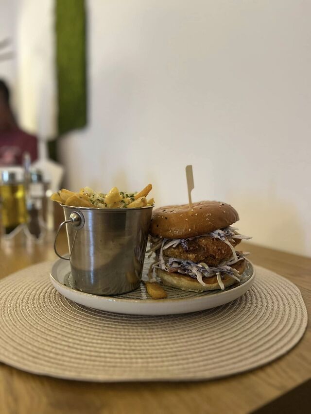 Bucăți crocante de pui, prăjite aurii și suculente la interior, servite alături de cartofi rumeniți, o salată proaspătă și sosuri delicioase. O masă completă care îmbină texturile și aromele pentru a-ți satisface pofta de bunătăți! 🍗🍟🥗